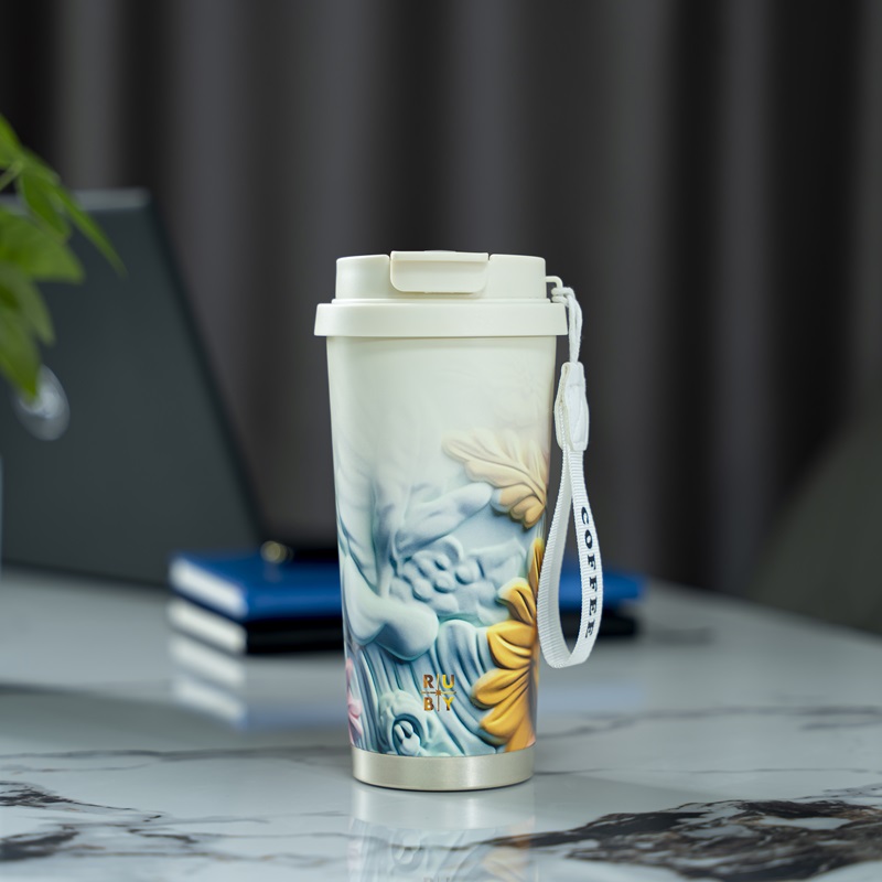 - Tiện ích đi kèm phong cách: Nắp đậy được thiết kế để uống trực tiếp, chống tràn hiệu quả. Quai xách bằng vải màu trắng tinh tế là một điểm nhấn thời trang, giúp việc mang theo trở nên dễ dàng và thuận tiện.