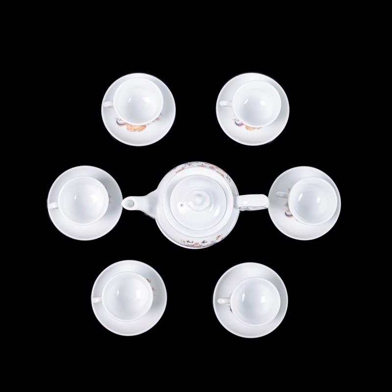 Ấn tượng đầu tiên về bộ ấm chén sứ Ruby là thiết kế thanh lịch, kiểu dáng truyền thống được bo tròn mềm mại, mang lại cảm giác gần gũi nhưng không kém phần sang trọng. Bộ sản phẩm gồm 1 ấm trà, 6 chén nhỏ kèm đĩa lót, tất cả đều được làm từ sứ trắng cao cấp, men mịn và đều màu.