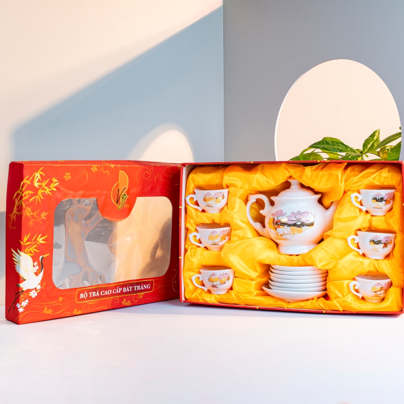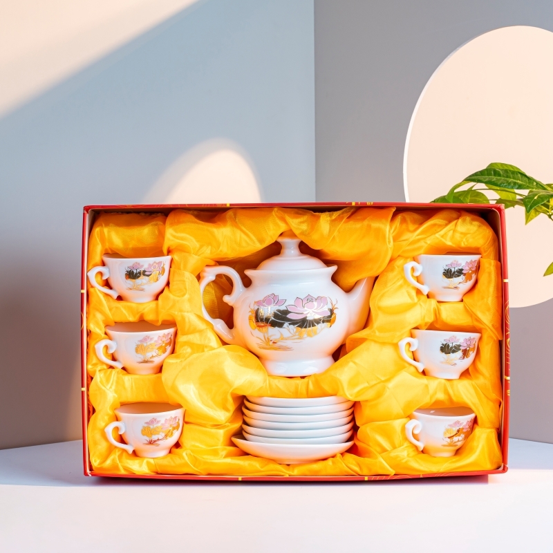 Ngoài chức năng sử dụng, bộ ấm chén sứ Ruby còn là món quà tặng đầy giá trị. Với thiết kế hoa sen tượng trưng cho sự thanh khiết, trang trọng, sản phẩm này rất phù hợp làm quà biếu vào các dịp như Tết, lễ kỷ niệm, tri ân khách hàng hoặc đối tác doanh nghiệp.