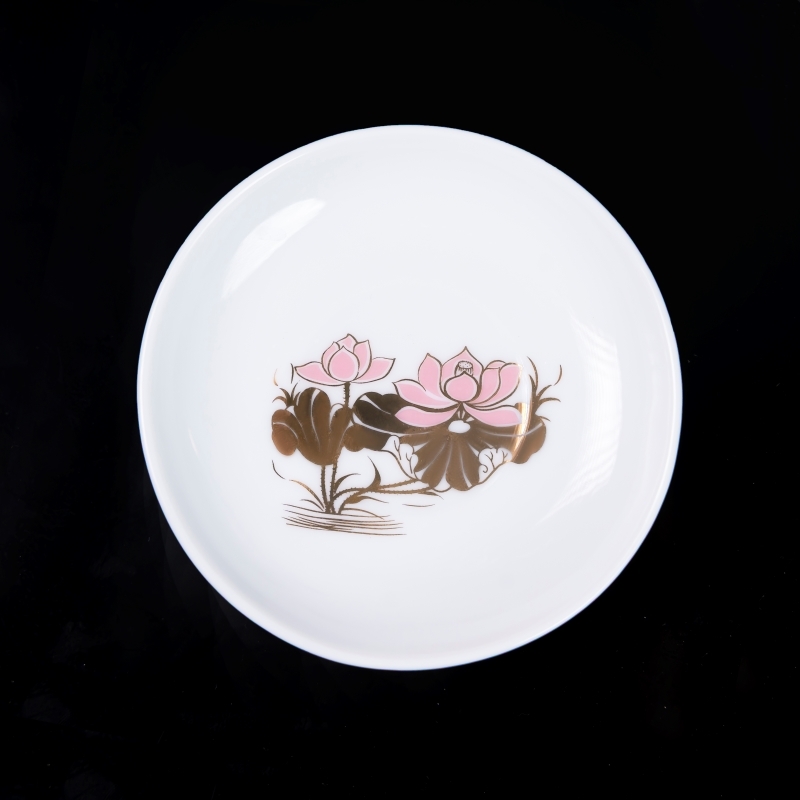 Bộ ấm chén sứ Ruby nổi bật với nền trắng tinh khôi được in họa tiết hoa sen màu hồng pastel xen lẫn vàng ánh kim, tạo nên tổng thể vừa trang nhã, vừa hiện đại. Hình ảnh được in rõ nét, phủ men bóng cao cấp, giúp tăng độ bền màu và khả năng chống trầy xước.