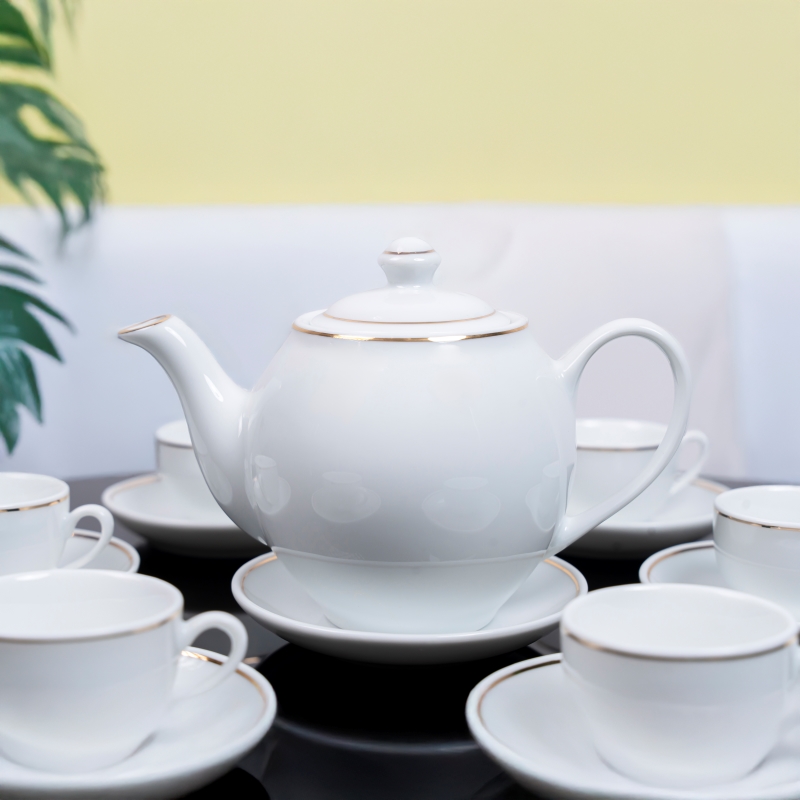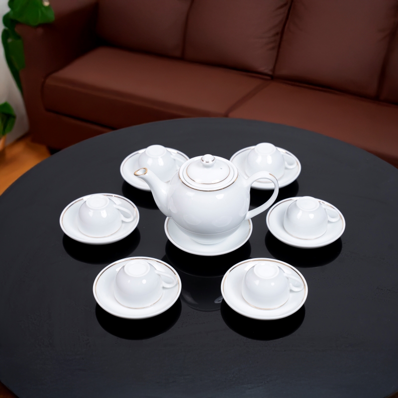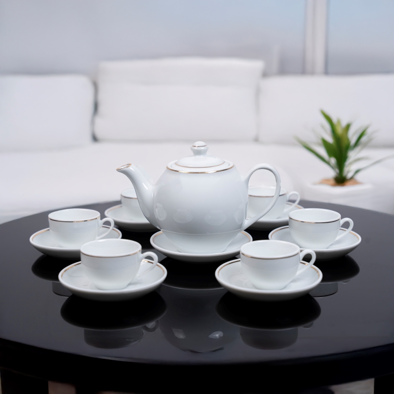 Bộ ấm chén sứ trắng viền vàng Ruby là một vật dụng thường ngày ấn tượng và cũng là một món quà biểu tượng của sự chăm chút, chu đáo và tinh tế trong từng chi tiết. Dù là để sử dụng trong gia đình, văn phòng hay làm quà tặng doanh nghiệp, bộ sản phẩm đều thể hiện đẳng cấp và sự chuyên nghiệp của người tặng.