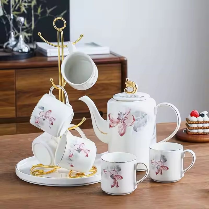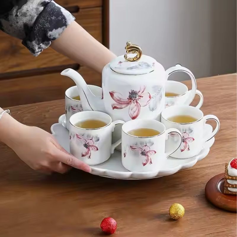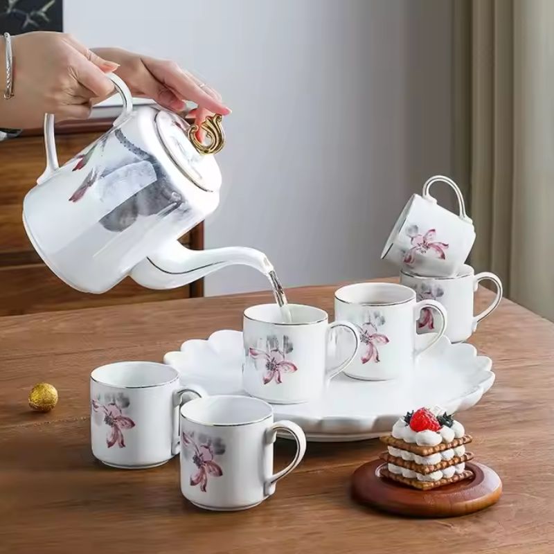 Bộ sản phẩm gồm một ấm trà có dáng bầu thanh thoát, sáu tách trà nhỏ xinh đồng bộ và một khay đựng hình oval với đường viền lượn sóng mềm mại. Điểm nhấn tinh tế là đường viền kim loại mảnh mai ở miệng tách và quai ấm, cùng với phần tay cầm trên nắp ấm được tạo hình xoắn ốc bằng kim loại mạ vàng sang trọng, không chỉ tăng tính thẩm mỹ mà còn thể hiện sự khéo léo trong chế tác.