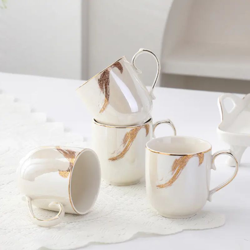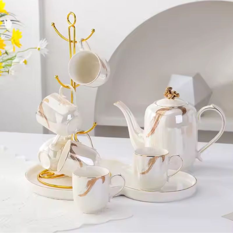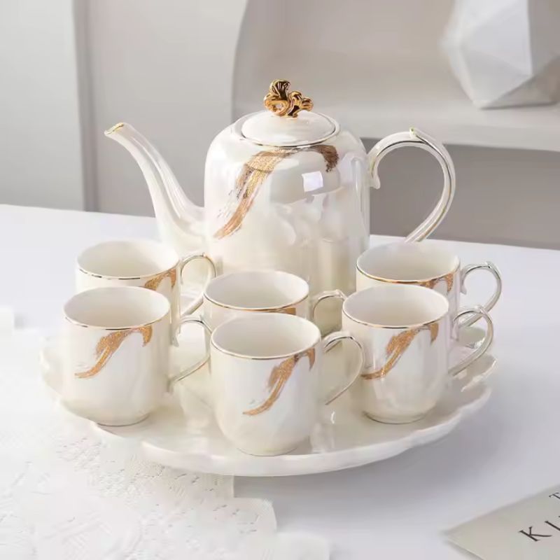Lấy cảm hứng từ phong cách hoàng gia châu Âu, bộ ấm chén gây ấn tượng bởi sắc trắng ngọc ngà phối cùng đường vân ánh kim uốn lượn mềm mại. Tay cầm và miệng rót được thiết kế tinh xảo, giúp trải nghiệm rót trà trở nên nhẹ nhàng và thanh thoát hơn bao giờ hết.