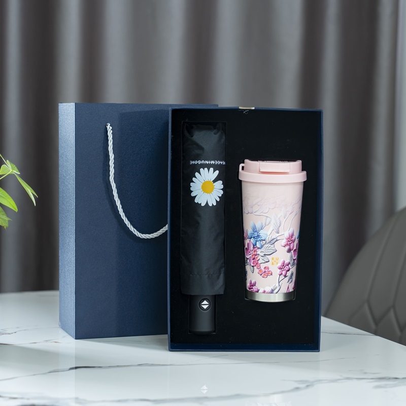 Bộ quà tặng SIM03863 là cách doanh nghiệp thể hiện sự trân trọng một cách tinh tế. Sự kết hợp giữa chiếc ô che chở bền bỉ và cốc giữ nhiệt có thiết kế nghệ thuật mang đến một món quà vừa thiết thực lại vừa có giá trị thẩm mỹ cao, phù hợp để gửi đến những đối tác và khách hàng quan trọng.
