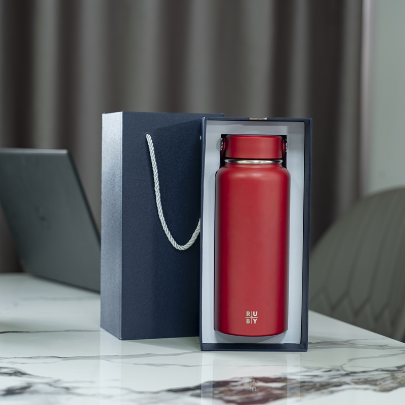Sự kết hợp giữa màu đỏ quyền lực của bình và màu xanh navy sâu lắng của hộp quà tạo ra một hiệu ứng thị giác ấn tượng, thu hút ngay từ cái nhìn đầu tiên. Thiết kế hộp xi rút sang trọng cùng khay mút định hình bên trong không chỉ bảo vệ sản phẩm mà còn nâng tầm trải nghiệm mở quà, thể hiện sự chuyên nghiệp trong từng chi tiết.