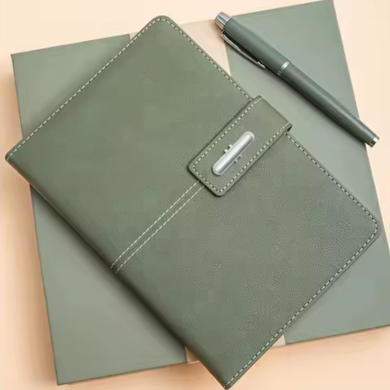 - Sổ tay da PU khổ A5: Được chế tác từ chất liệu da PU cao cấp, mềm mại với gam màu xanh olive thanh lịch. Kích thước A5 tiêu chuẩn, lý tưởng cho việc ghi chép trong các cuộc họp, lên kế hoạch công việc hàng ngày hoặc lưu giữ những ý tưởng sáng tạo. Sổ tay được trang bị khóa cài kim loại sáng bóng, tăng thêm vẻ sang trọng và bảo quản tài liệu bên trong.