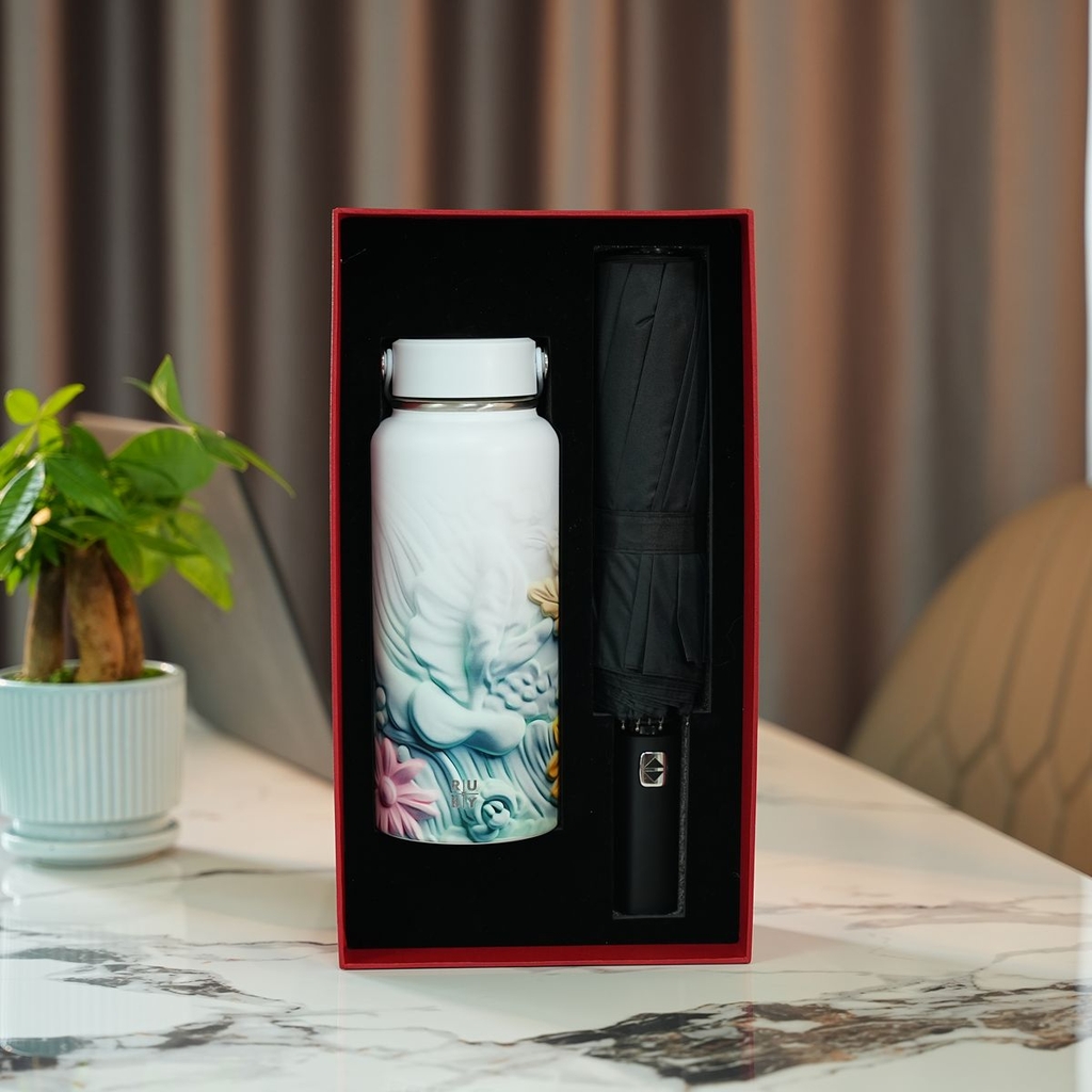 Sự kết hợp giữa chiếc bình giữ nhiệt họa tiết 3D độc đáo và ô cao cấp màu sắc thời thượng mang đến cảm giác hài hòa, hiện đại. Tất cả được sắp đặt tinh tế trong hộp quà đen sang trọng, có quai xách tiện lợi giúp món quà thêm phần đẳng cấp và dễ dàng mang theo.